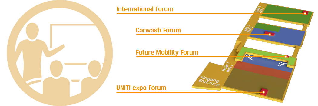 Vorträge werden in Englisch oder Deutsch gehalten und simultan in Deutsch bzw. Englisch übersetzt. Das Forum ist zentral in Halle 3 auf der Carwash Piazza platziert.